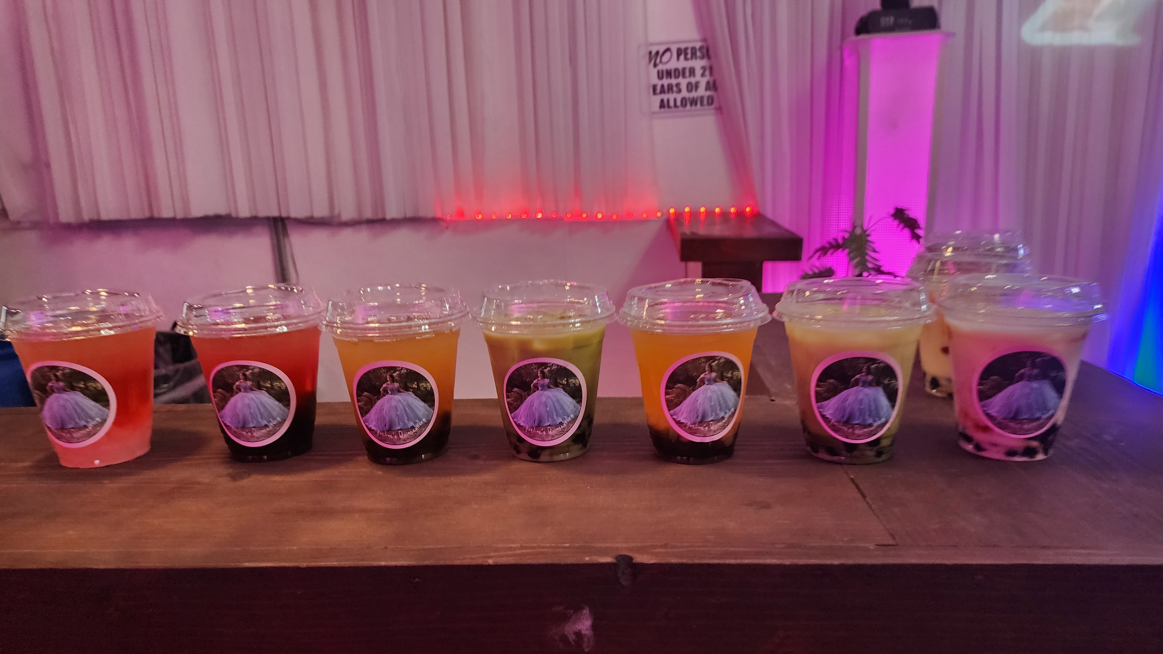 For our Plus and Deluxe packages, we offer fully personalized cup stickers as a flair for all of your event attendees. You can send us your own design, or let us design you a sticker with a picture you provide for no additional cost.